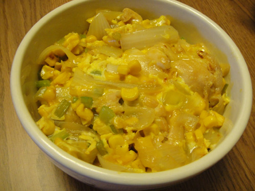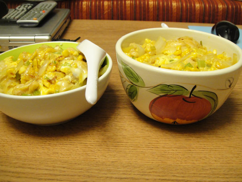 這一鍋裡面有雞肉、洋蔥、芹菜、綠巨人玉米粒,和食譜上的食材有些不一樣,因為有些食材在超市怎麼找都找不到。食材炒的差不多了,先加入了三分之二的蛋液,待蛋汁稍微凝固之後,再將剩餘的蛋液倒入,但不能讓蛋液完全熟透,否則就不好吃了。